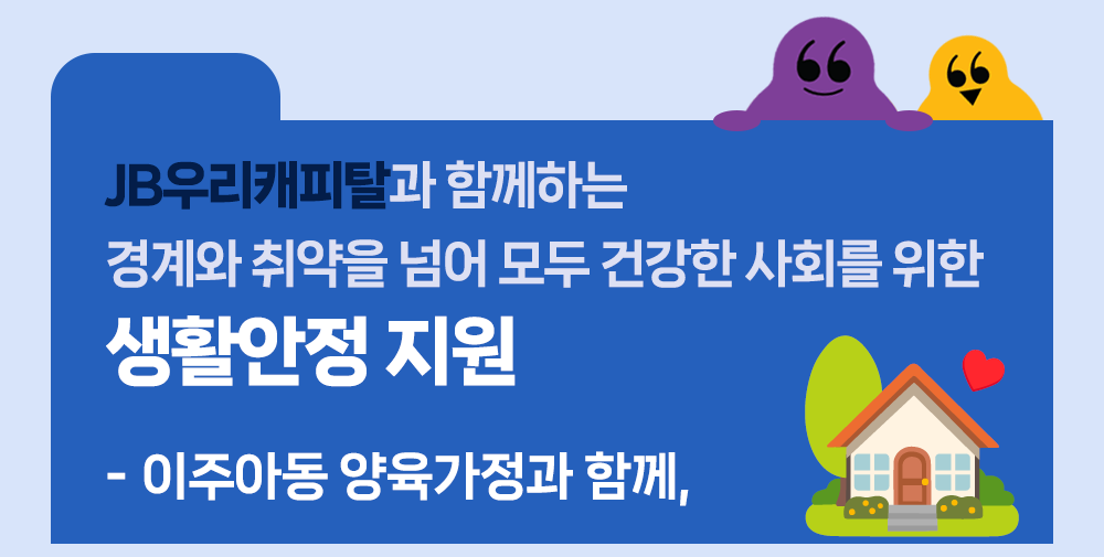 희망의친구들은 JB우리캐피탈과 함께 갑작스러운 위기로 경제적 어려움을 겪고 있는 이주아동 양육가정 중 심사를 통해 선정된 20가정에게 주거비, 생계비, 아동 생활비 등으로 사용할 수 있는 생활안정 지원금을 6개월 동안 60만 원씩 지원합니다.