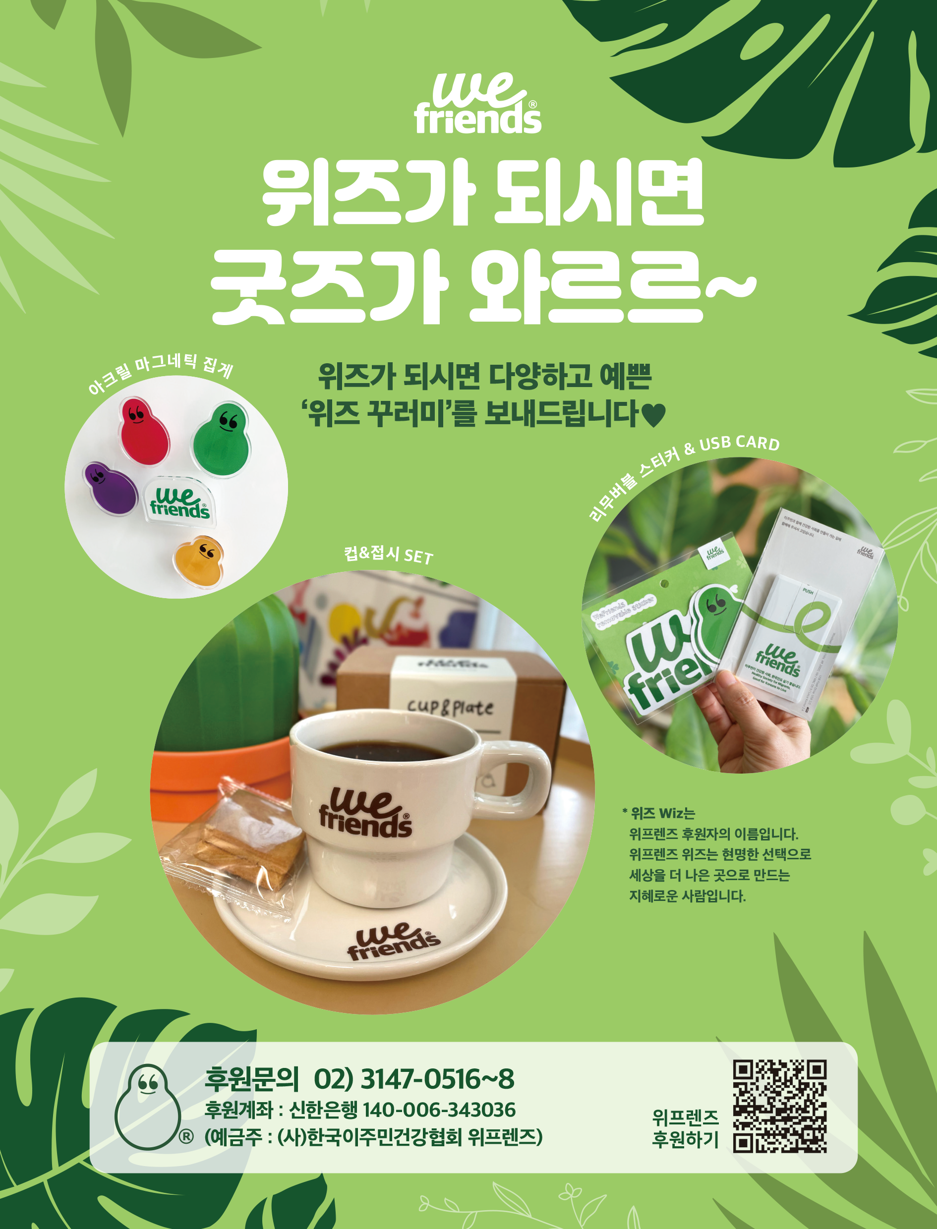 후원을 시작하면, 설레는 선물 상자가 도착합니다. 위프렌즈 후원자만을 위한 스페셜 패키지 ‘위즈 꾸러미’! 머그컵과 배지, 마그네틱 집게 등 생활 속에서 유용하게 쓰이는 굿즈들이 가득 담겨 있어요. 이번에 새롭게 리뉴얼된 디자인을 영상을 통해 먼저 만나보세요! 후원으로 나눔을 실천하고, 일상 속에서 위프렌즈의 따뜻함을 느껴보세요. 🎁
