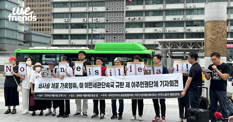 9월 9일, 위프렌즈는 외국인이주·노동운동협의회, 이주구금대응네트워크, 이주노동자평등연대가 주최한 ‘쇠사슬 체포 가혹행위, 미 이민세관단속국 규탄 제 이주인권단체 기자회견’에 함께했습니다.참석 단체들은 ▲손발 쇠사슬 연행은 「만델라 규칙」 위반에 따른 명백한 인권침해 ▲출장·단기 체류 비자 소지자까지 포함된 무분별한 단속 ▲정치적 목적에 따른 한국 기업·노동자 희생 등을 강하게 비판했습니다. 또한, 미국에서의 인권침해를 비판하면서 정작 한국 내에서 일상적으로 자행되는 폭력적 단속과 구금은 외면하는 정부의 이중성을 지적했습니다.