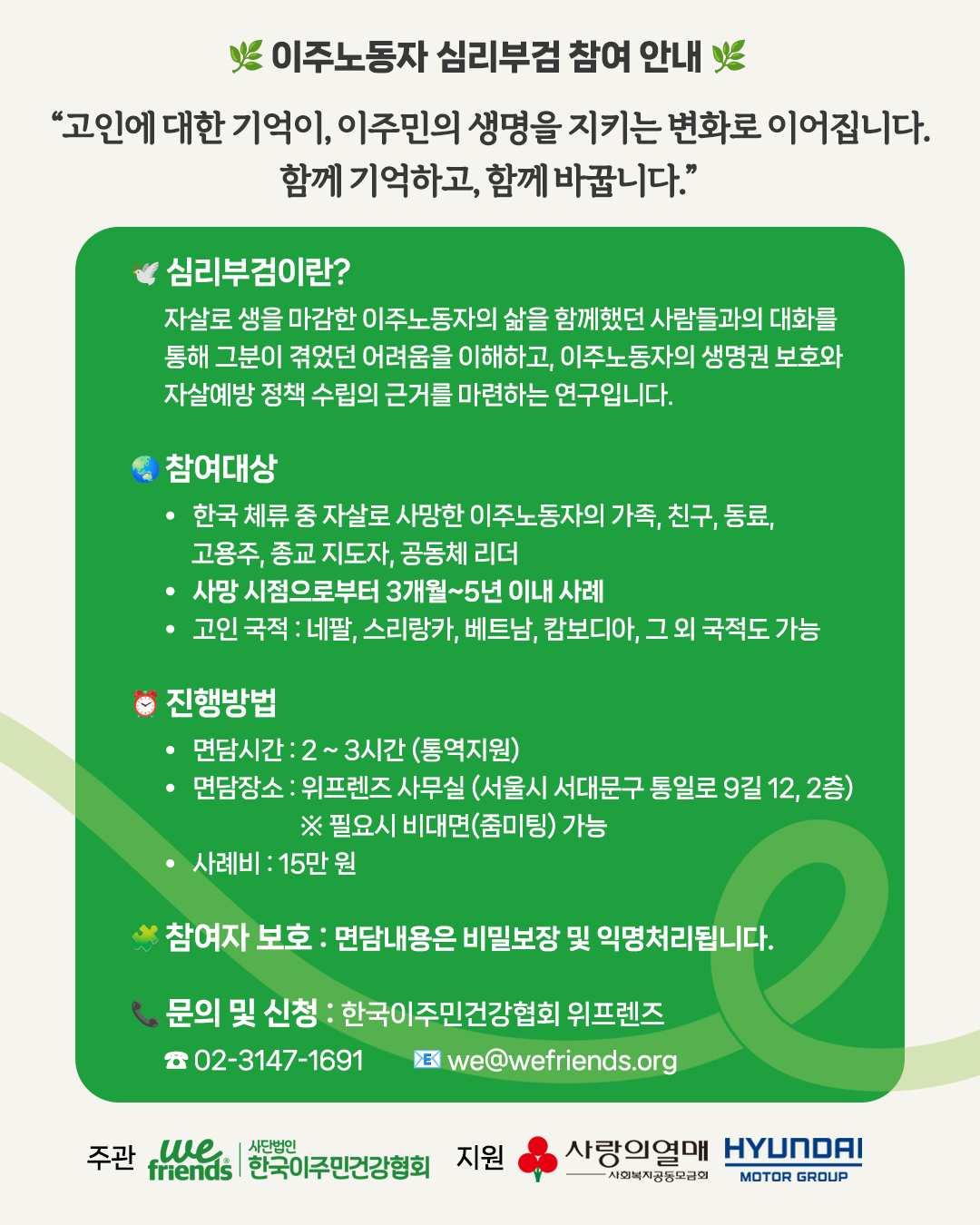 μ΄μ£Όλ Έλμμ μλͺ κΆ λ³΄νΈμ μμ΄ μλ°© μ μ± λ§λ ¨μ μν 'μ΄μ£Όλ Έλμ μ¬λ¦¬λΆκ²' μ°κ΅¬μ μ°Έμ¬νμ€ λΆλ€μ μ°Ύμ΅λλ€. μ¬λ¦¬λΆκ²μ μμ΄λ‘ μ¬λ§ν μ΄μ£Όλ Έλμμ μ΄λ €μμ μ΄ν΄νκ³ λ³νλ₯Ό μ΄λμ΄λ΄κΈ° μν΄, κ³ μΈκ³Ό ν¨κ»νλ κ°μ‘±, μΉκ΅¬, λλ£, κ³ μ©μ£Ό, 곡λ체 리λ λ± κ΄κ³μλΆλ€κ³Ό λ©΄λ΄μ μ§νν©λλ€. κ³ μΈμ λν κΈ°μ΅μ΄ μ΄μ£Όλ―Όμ μλͺ μ μ§ν€λ λ³νλ‘ μ΄μ΄μ§ μ μλλ‘, λ§μ κ΄μ¬κ³Ό μ°Έμ¬ λΆνλ립λλ€.